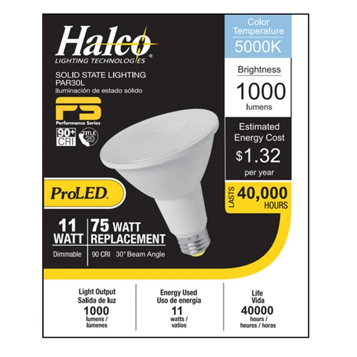 Halco LED PAR30L Narrow Flood 11W 5000K 30Deg Dimmable 90+ CRI 1000 Lumen White Housing T20 (Performance Series) (6-Pack). Cool White LED PAR Floods.