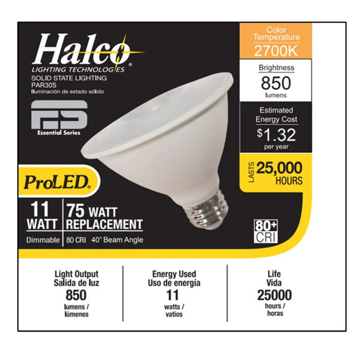 Halco LED PAR30S Flood 11W 2700K 40Deg Dimmable 80+ CRI 850 Lumen White Housing (Essential Series) (6-Pack). Warm White LED PAR Floods.