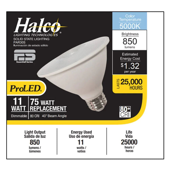Halco LED PAR30S Flood 11W 5000K 40Deg Dimmable 80+ CRI 850 Lumen White Housing (Essential Series) (6-Pack). Cool White LED PAR Floods.