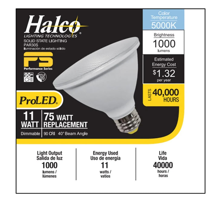 Halco LED PAR30S Flood 11W 5000K 40Deg Dimmable 90+ CRI 1000 Lumen White Housing T20 (Performance Series) (6-Pack). Cool White LED PAR Floods.
