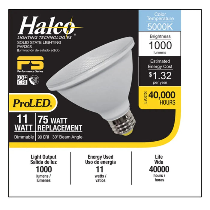 Halco LED PAR30S Narrow Flood 11W 5000K 30Deg Dimmable 90+ CRI 1000 Lumen White Housing T20 (Performance Series) (6-Pack). Cool White LED PAR Floods.