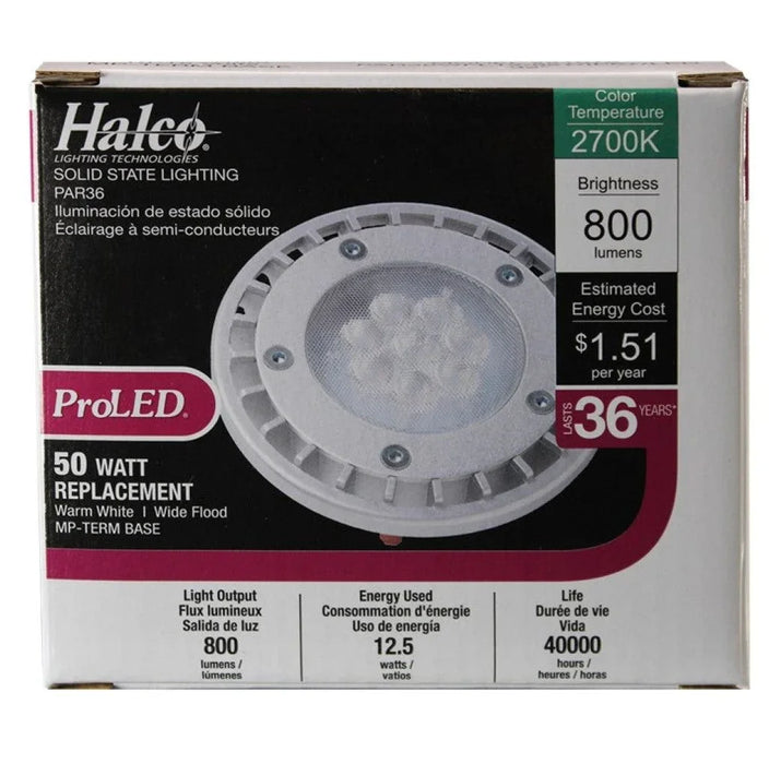 Halco LED PAR36 Wide Flood 12W 2700K Dimmable 32 MP-Term Wet Location Silver 10-15V - 800 Lumen - 40000 hours - 80CRI (6-Pack). Warm White LED PAR Floods.