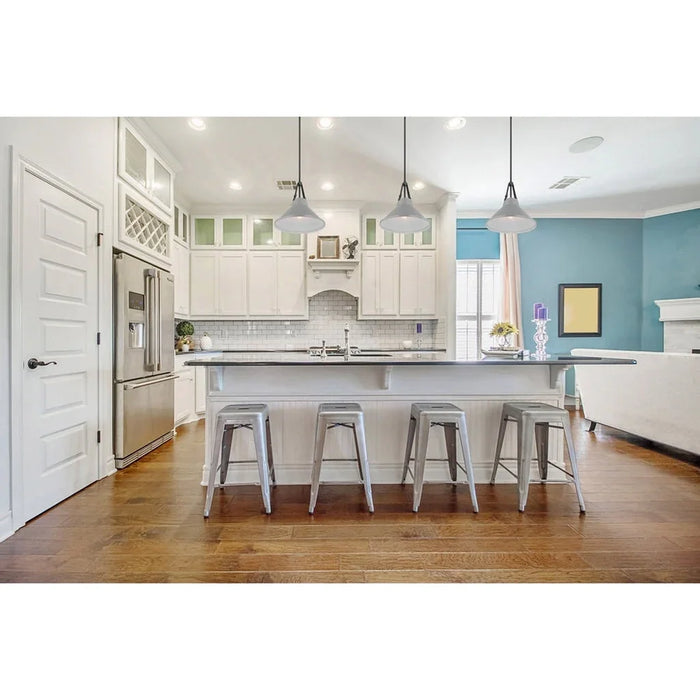 The Zelda trio of pendants are crafted with simplicity and function at the core of their industrial design. Adorned with faux leather straps to match the black finish, they add textile elegance to the metal shade. The shade is painted white on the interior to reflect maximum light output. They are available in matte black with three complimenting shade colors, gray, black and white, three choices to opt from for your lighting needs.